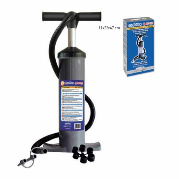 Gonfleur ultra solide double action avec un axe aluminium beaucoup plus solide: (gonfleur à piston double action 2 x 2000cc). Pression jusqu’à 800 mBar (11.6 psi).